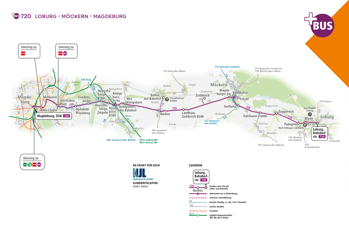 Die PlusBus-Linie 720 fährt von Loburg über Möckern und Königsborn nach Magdeburg.