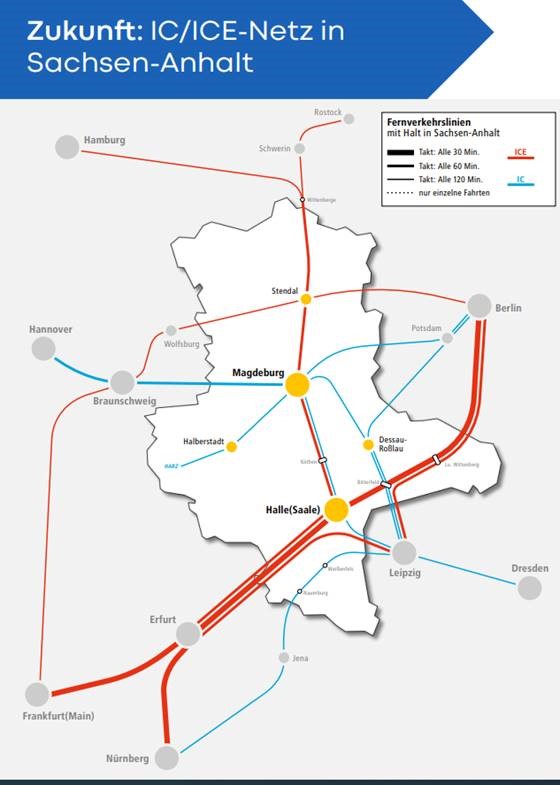 Handlungsbedarf gebe es überall im Land, betonte die Ministerin. „Neben Halle muss aber endlich auch Magdeburg auf ICE-Niveau an die Metropolen Berlin, Hamburg, München und Frankfurt am Main sowie über Hannover weiter nach Westdeutschland und an die benachbarten Wirtschaftsräume Rostock und Dresden angebunden werden“, betonte sie. Nicht zuletzt mit Blick auf die bevorstehende Ansiedlung von INTEL nahe der Landeshauptstadt und den Aufbau des „Zukunftszentrums für Deutsche Einheit und Europäische Transformation“ in Halle sei die Ausweitung der Fernverkehrsangebote im Land alternativlos, um die zu erwartenden Pendler- und Besucherströme bewältigen zu können, hob Hüskens hervor.